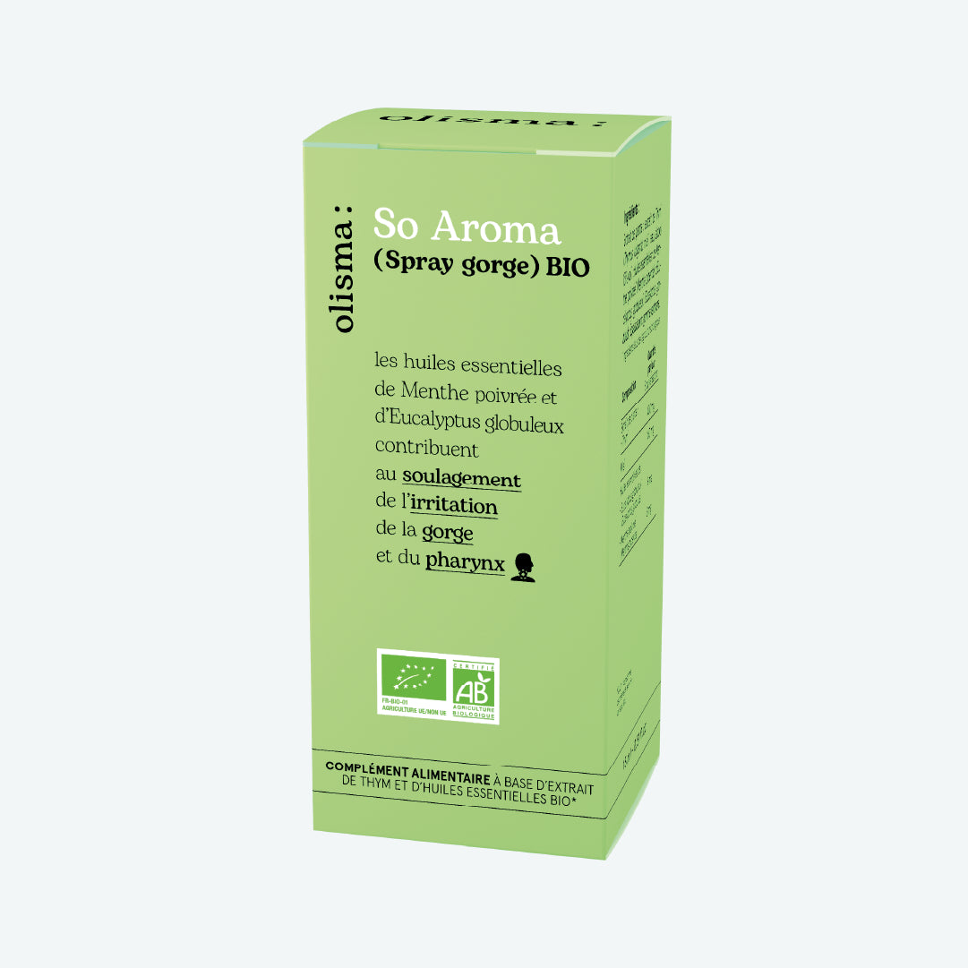 • Les huiles essentielles de Menthe poivrée Bio et d’Eucalyptus globuleux contribuent au soulagement des irritations de la gorge et du pharynx.