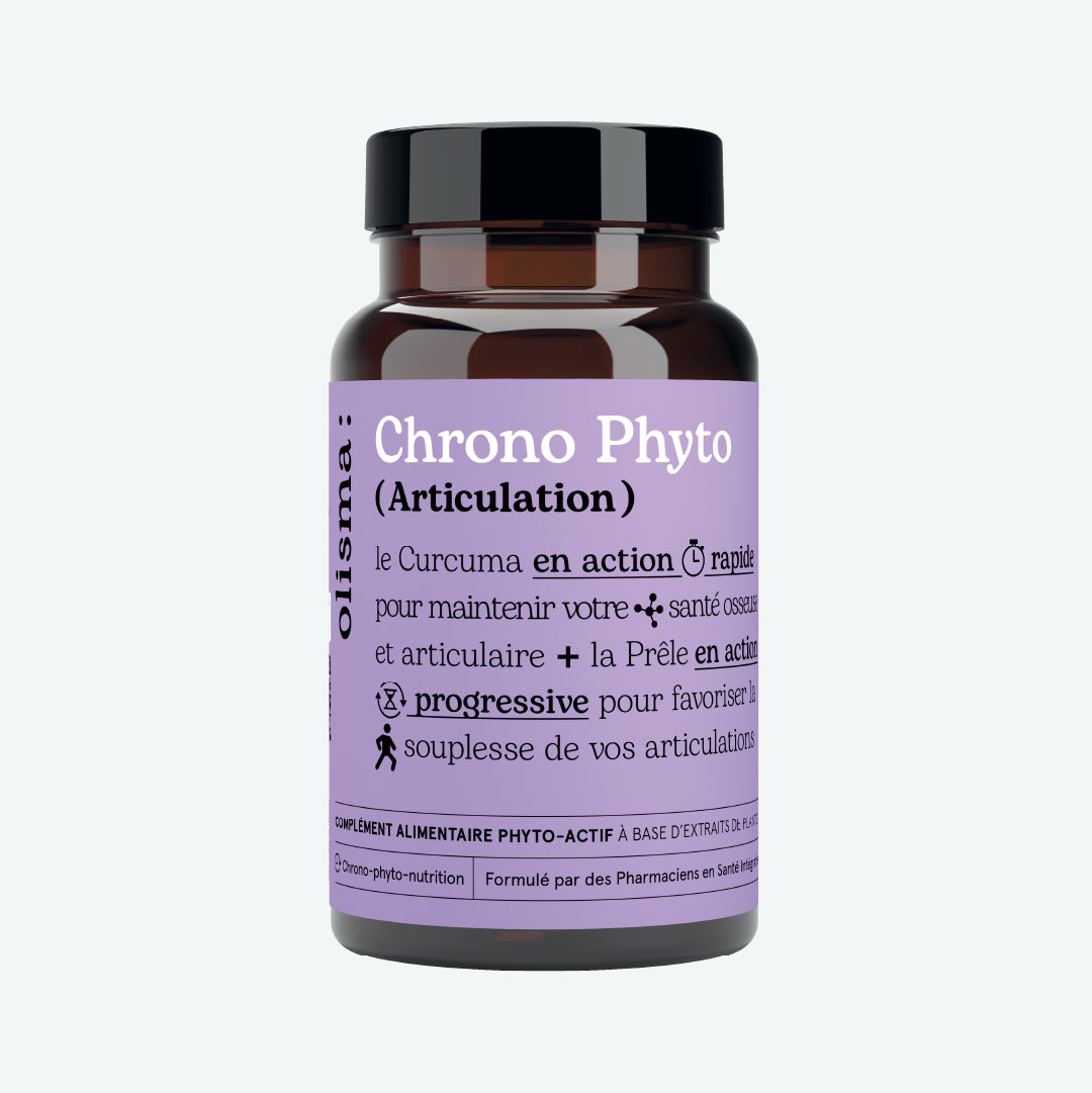 Étape 1 : Olisma Articulation. Grâce à l’innovation Chrono Phyto, ce complément associe le Curcuma, en action rapide pour maintenir la santé osseuse et articulaire, et la Prêle, en action progressive pour soutenir la souplesse des articulations. Une synergie unique pour un confort articulaire durable.
