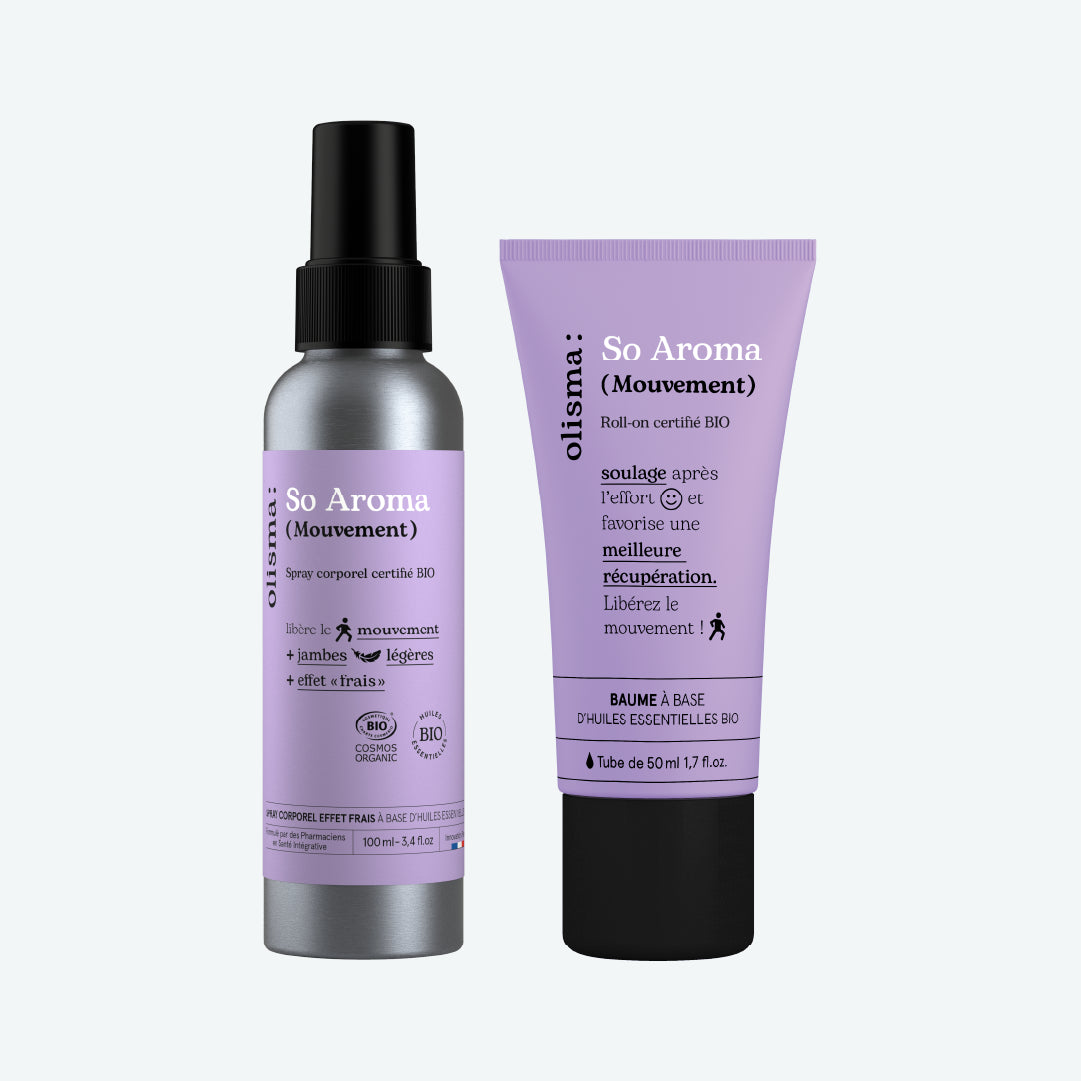 Pour renforcer l’effet détente, le Spray Mouvement Olisma complète la pratique. Sa formule aux 10 huiles essentielles 100 % Bio, dont l'Hélichryse, la Gaulthérie ou encore le Romarin, procure un effet frais immédiat qui apaise les tensions musculaires et favorise la récupération.